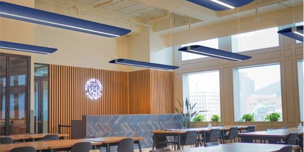 The direct-indirect luminaire holds a patent for its unique design, which combines high performance optics and the most advanced acoustic materials.