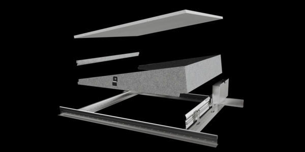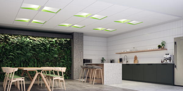 Lean is an acoustic lay-in where project ceiling tiles become part of the luminaire.